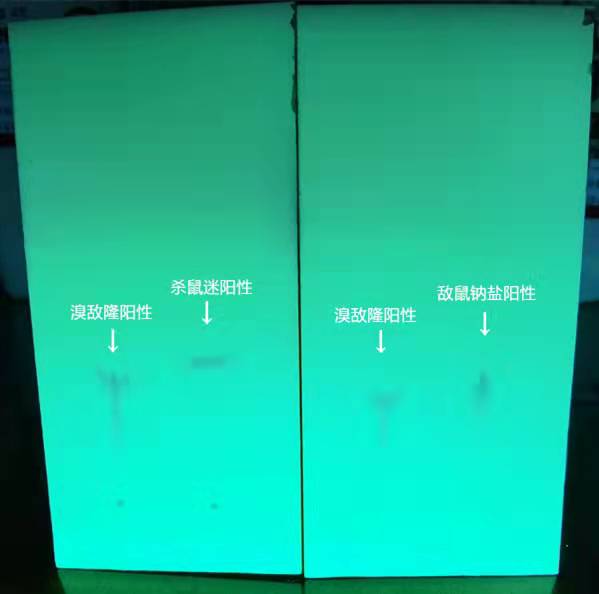 4.6在层析板完全干透后,关闭紫外线灯,用紫光手电筒照射层析板,敌鼠钠斑点会有较强的荧光出现。